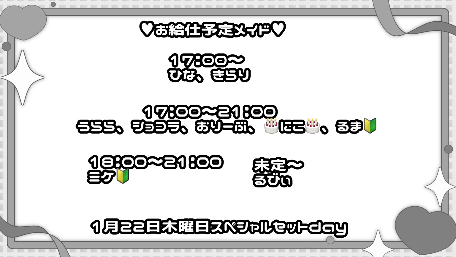 1月22日(木曜日)のお給仕予定メイド ! - HeaRTS劇場ドン・キホーテ立川店